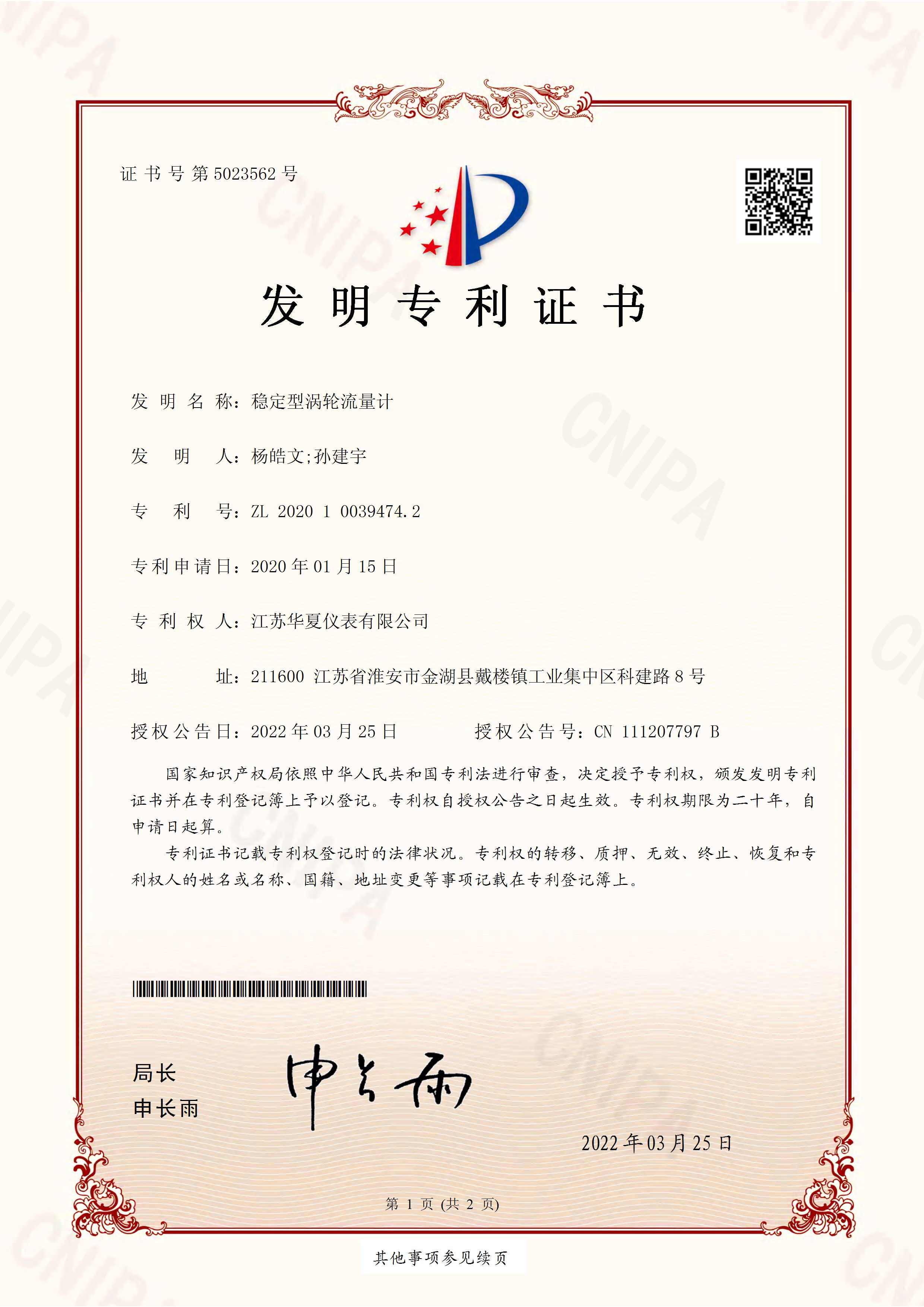 穩定型渦輪流量計發明專利證書